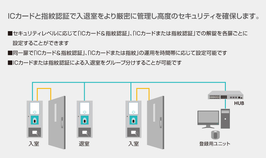 複数種類のICカードを読み取るので、既存カードの継続利用が可能となり、異なるカードを持つテナントの同居に対応。共用部への導入に適しています。 指紋認証とICカード認証の融合による、マルチモーダルな入退室管理を実現します